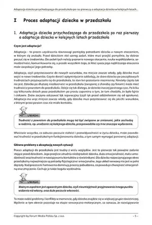 Oprócz ogólnych wiadomości i rad, opracowanie zawiera wiele propozycji zajęć grupowych i indywidualnych sprzyjających adaptacji i integracji przedszkolaka z nowym otoczeniem. Każdy scenariusz zajęć integracyjnych w przedszkolu uwzględnia opis pomocy dydaktycznych, formy zajęć, ilość osób w grupie i cele, jakie ma za zadanie osiągnąć. Jest to niezwykle pomocne dla nauczyciela/ wychowawcy przedszkolnego, który chce zadbać o komfort psychiczno-emocjonalny wszystkich swoich wychowanków i sprawnie prowadzić zajęcia.
