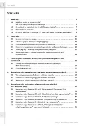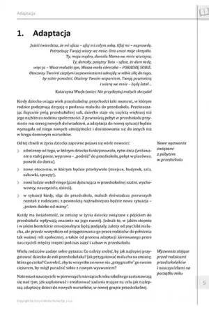 Opracowanie skupia uwagę na dzieciach wieku przedszkolnego i adaptacji w środowisku przedszkolnym, jednak uniwersalność porad i wskazówek daje możliwość wykorzystania ich w środowisku szkolnym. Prócz tego zawiera liczne scenariusze zajęć, podzielone według wieku, dzięki czemu zabawy i gry są atrakcyjne, dostosowane do poziomu intelektualnego dzieci. Nauczyciel przedszkolny lub opiekun, wykorzystując gotowe scenariusze może niemal natychmiast rozpocząć procedury adaptacyjne, oszczędzając przy tym czasu i mając poczucie „celności” swoich działań.