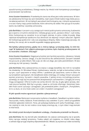 Julia Barlińska: Sprawca cyberprzemocy zaś czuje się bezkarny i bezpieczny, bo ma poczucie nieidentyfikalności. Wprawdzie fałszywe, bo dziś można namierzyć sprawcę, gdy przemoc przybiera skrajną formę. Ale sprawca nie myśli o tym w momencie klikania…