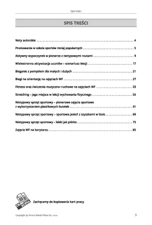 W książce znajdziesz 4 scenariusze zajęć WF, propozycje ćwiczeń z butelkami, a także inne ciekawe pomysły, które urozmaicą zajęcia wychowania fizycznego. Karty pracy są w formie przystosowanej do kopiowania.