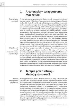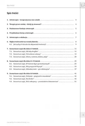Scenariusze zajęć są niezwykle zróżnicowane i zawierają ćwiczenia, gry oraz zabawy z udziałem narzędzi artystycznych. Każdy scenariusz został wnikliwie opisany, by nauczyciel mógł krok po kroku realizować przedstawiony program, dążąc do przedstawionych na początku celów, jakie powinien osiągnąć. To uporządkuje system pracy, zaoszczędzi czasu na opracowanie nowych form aktywacji dzieci i wesprze ich całościowy rozwój emocjonalny. Opracowanie może stać się również domową formą urozmaicenia nauki w domu lub być dodatkiem, do aktywnego spędzania wolnego czasu.