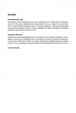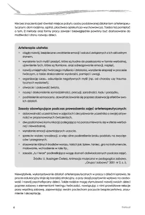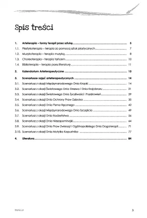 Pozycja zawiera opis czterech najpopularniejszych metod arteterapii. W drugiej części książki znajdziemy Kalendarium Arteterapeutyczne z nietypowymi świętami przedszkolnymi, a także 10 scenariuszy zajęć artetetapeutycznych.