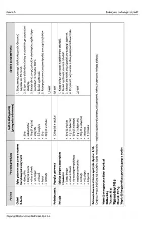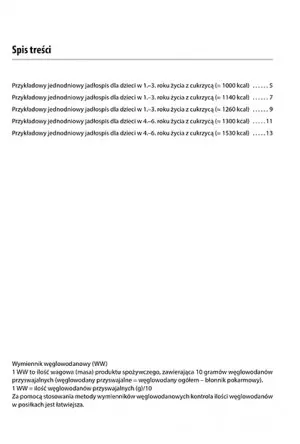 Pod każdym jadłospisem znajduje się rekomendowane dzienne spożycie płynów, wartość energetyczna proponowanej diety, a także ilość białek, tłuszczów, węglowodanów, błonnika oraz wapnia. Na początku publikacji znajduje się także wyjaśnienie pojęcia „wymiennik węglowodanowy”.