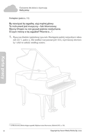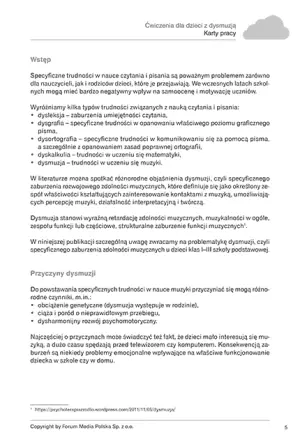 W publikacji znajdziesz gotowe karty pracy z różnorodnymi ćwiczeniami, które można z powodzeniem wykorzystać zarówno w szkole, na zajęciach dodatkowych, jak i w warunkach domowych, co pozwala na systematyczne wspieranie rozwoju dziecka. Uzupełnieniem materiałów są praktyczne wskazówki dotyczące organizacji zajęć, pomagające w ich efektywnym planowaniu i dostosowaniu do potrzeb uczniów. Całość wzbogacają ćwiczenia rytmiczne, ruchowe i słuchowe, które w angażujący sposób rozwijają zdolności muzyczne oraz wspierają harmonijny rozwój dziecka.