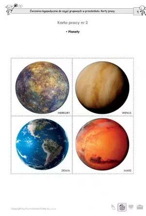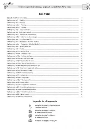 Publikacja zawiera 15 kart pracy: 3 dla niemowląt i małych dzieci, 9 dla dzieci w wieku przedszkolnym i 3 dla dzieci w wieku szkolnym. Każda karta oznaczona jest specjalnym piktogramem.