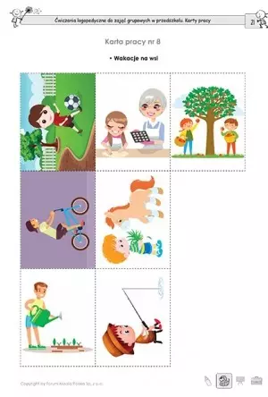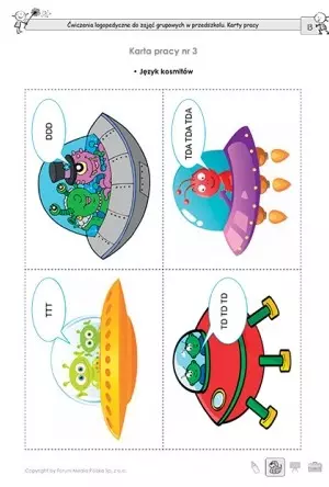 Znajdziesz tu takie zadania, jak: układanie zdań z rozsypanki wyrazowej, ćwiczenia oddechowe, naśladowanie różnych dźwięków, memory – gra pamięciowa oraz układanie puzzli. Na końcu publikacji znajduje się miejsce na notatki, gdzie możemy notować spostrzeżenia, a także informacje o „kamieniach milowych” i postępach dziecka.