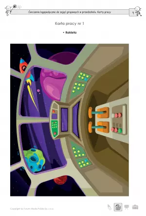 Publikacja zawiera scenariusz o tematyce planet i rakiet kosmicznych. Jest przeznaczony dla nauczycieli i logopedów, z myślą o pracy grupowej z dziećmi w wieku przedszkolnym. Dla ułatwienia grupa wiekowa jest oznaczona piktogramem na dole strony.