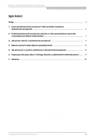 Ponadto w poradniku znajdziesz studium przypadku dziecka uzdolnionego plastycznie z dysharmonią rozwojową, ilustracje prac, które mogą przybliżyć problem, 13 propozycji kart pracy dla dzieci z uzdolnieniami matematycznymi w wieku 6-7 lat, literaturę, dzięki której możesz sięgnąć po inne pozycje dotyczące problemu i miejsce na notatki na końcu publikacji.