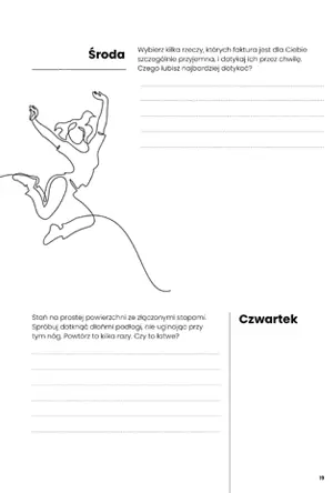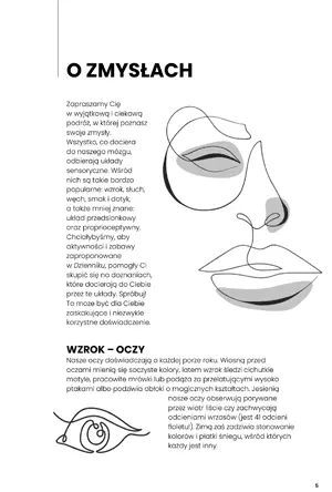 - Ponad 200 ćwiczeń, aktywności i zabaw, które pomogą Ci skupić się na doznaniach, docierających przez układy sensoryczne: wzrok, słuch, węch, smak i dotyk, układ przedsionkowy oraz proprioceptywny.