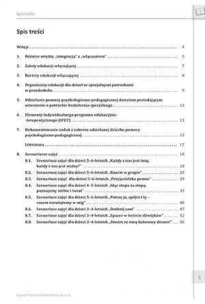 Stworzone na potrzeby opracowania scenariusze zajęć, to autorski sposób przedstawienia tolerancji i metod, które mają na celu zburzenie barier pomiędzy osobami niepełnosprawnymi a osobami zdrowymi. W łatwy i przystępny sposób wskazują różnice społeczne, podkreślając, że inność nie jest wadą, a wymaga wyłącznie innego podejścia – komunikacyjnego, emocjonalnego czy społecznego. Każda z kart zawiera opis celów, metod pracy, formy pracy, a także niezbędnych narzędzi dydaktycznych do wykonania ćwiczeń, co przyczynia się do sprawnego przeprowadzenia lekcji. Ćwiczenia są niezwykle zróżnicowane i uwzględniają zadania ruchowe, co wpłynie korzystnie na fizyczne umiejętności dzieci oraz uatrakcyjni formę zajęć.