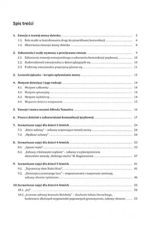 1. Emocje a rozwój mowy dziecka Małgosia z niecierpliwością oczekiwała dnia 60. urodzin swojej ukochanej babci Marysi. Narysowała dla niej duże serce z różą w środku. I choć miała zaledwie trzy latka, nauczyła się wierszyka „Jestem różyczka, wypadłam z koszyczka, nie umiem winszować, ale babcię ucałować!”. Z pewnością pragnęła ucałować, ukochać babcię małymi raczkami, tak mocno, jak tylko potrafi. Kiedy więc nadszedł dzień święta babci przy pomocy mamy założyła odświętną sukienkę, spakowała do ozdobnej torebki swoje serce i gotowa czekała na uroczystość. W dużej restauracyjnej sali zebrało się wielu gości. Były ciocie, wujkowie, starsi kuzyni i kuzynki. I były jakieś panie i jacyś panowie, których Małgosia nie znała. Wszyscy się do niej uśmiechali, wszyscy coś do niej mówili, jednak dziewczynka słyszała tylko bicie swojego serca. A kiedy nadszedł czas składania życzeń, ona stanęła przed ukochaną babcią i nie mogła wydobyć z siebie ani jednego słowa. Bródka jej się trzęsła, po policzku spłynęła łezka. „Je…, je…, jestem…, jestem…, jestem…” – powtórzyła kilka razy i zawstydzona pobiegła w kąt. Skuliła się tak mocno, by nic nie widzieć i nic nie słyszeć. I kiedy myślała, że już nikt na nią nie patrzy, otworzyła oczy i zobaczyła nad sobą babcię. „Chodź do mnie” – usłyszała ciepły głos babci. Natychmiast wyciągnęła małe rączki, objęła babcię i cichutko powiedziała „Ko-cham cię”. Pani Małgosia została poproszona przez dyrektorkę o poprowadzenie warsztatów metodycznych dla nauczycieli. Jesteś doświadczonym pedagogiem, posiadasz odpowiednie kompetencje i warto, byś podzieliła się swoją wiedzą.