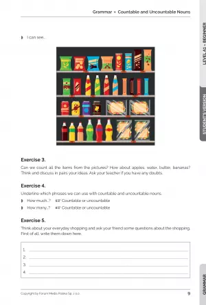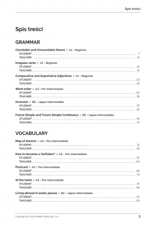Całe opracowanie sformułowane jest w języku angielskim, dzięki czemu uczeń oswaja się z każdą formą językową, a urozmaicone zadania, które wychodzą poza ramy sztywnego nauczania językowego, są atrakcyjne, proste i lepiej przyswajalne. Stosując niniejsze opracowanie, nauczyciel może mieć pewność, że jego zajęcia będą dla ucznia ciekawą alternatywą dydaktyczną, dostosowaną do jego poziomu, co zwiększy motywację do nauki.