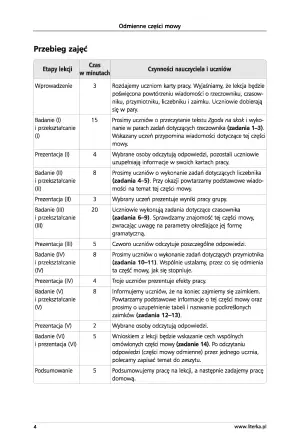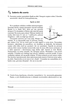 Książka zawiera takie propozycje zadań, jak: praca ze słownikiem, uzupełnianie zdań, praca z tekstem, tworzenie krótkich form pisemnych i podkreślanie w tekście części mowy.