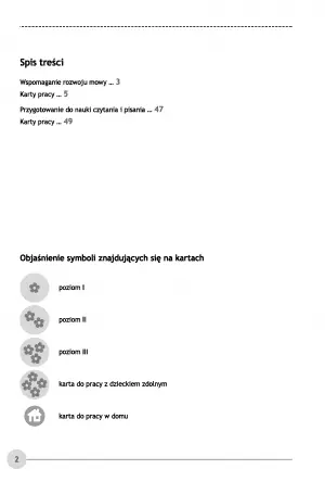 Karty oznaczone są odpowiednimi symbolami, takimi jak: poziom 1, 2, 3, karta do pracy z dzieckiem zdolnym i karta do pracy do domu.
