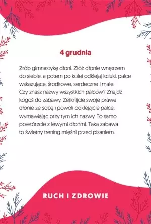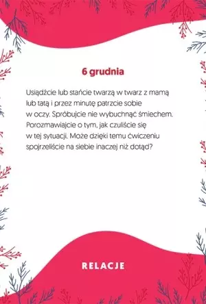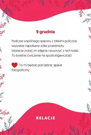Redakcja czasopisma „Małe Charaktery” przygotowała 30 kart z pomysłami na zadania i ćwiczenia aż do Wigilii wraz z dodatkowymi zabawami. Każde z ćwiczeń przygotowane jest tak, aby dziecko mogło wykonać je samodzielnie, bawiąc się z przyjaciółmi lub członkami rodziny.