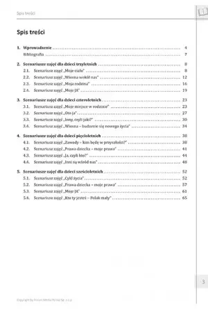 Prócz tego ćwiczenia rozwijają m.in. percepcję wzrokową, umiejętności motoryczne, grafomotoryczne, przestrzenne, a zabawy ruchowe, wycinanki, wyklejanki i kolorowanki z przyjemnością zachęcą dziecko do pełnego zaangażowania. Każda karta zadań informuje o niezbędnych narzędziach dydaktycznych potrzebnych do wykonania zadania, dzięki czemu nauczyciel szybciej i łatwiej przygotuje się do zajęć. Scenariusze zajęć obejmują dzieci w wieku od trzech do sześciu lat.