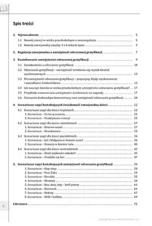 Opracowanie dokładnie opisuje, jak wygląda przebieg rozwoju emocjonalnego dziecka w okresie przedszkolnym. Dodatkowo zwraca uwagę na częste błędy wychowawcze, które mogą zaburzać kształtowanie odporności emocjonalnej. Zawarte informacje w niniejszej pozycji podpowiadają jak samoregulację przenieść na inne dziedziny życia przedszkolaka tj. nauczyć go cierpliwości, rozsądnego gospodarowania finansami i spokojnie czekać na rezultaty swoich wysiłków. Te wszystkie elementy wymagają samoregulacji emocjonalnej, bo to emocje często popychają nas do podejmowania konkretnych decyzji. Dzięki temu, dziecko od najmłodszych lat dążyć będzie do stabilizacji i podejmowania trafnych wyborów.