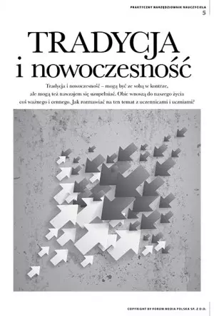 Problem możemy dostrzegać dopiero, kiedy młody człowiek wyraźnie dyskredytuje jedną z tych płaszczyzn – w imię nowoczesności odrzuca tradycję i neguje jej wartość lub odwrotnie – zamyka się na wszystko, co nowe. Zajęcia poświęcone tradycji i nowoczesności powinny zmierza zarówno do poszerzenia wiedzy uczennic i uczniów na ten temat (jest to przydatna wiedza o świecie, kulturze i nauce), jak i do kształtowania w nich postawy pewnej równowagi, wyrażającej się w świadomości znaczenia i wartości i tradycji, i nowoczesności.