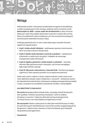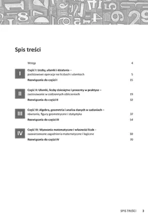 - Część III: Algebra, geometria i analiza danych w zadaniach – równania, własności figur geometrycznych i statystyka, czyli tematy wymagające logicznego myślenia i precyzji.