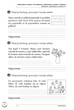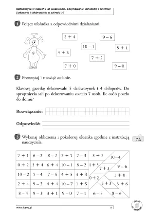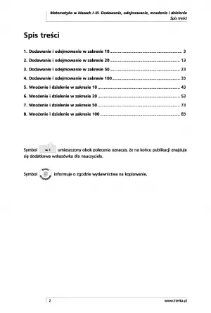 Odpowiednio dobrane zadania, dostosowane do etapu rozwojowego ucznia, sprawią, że dodawanie, odejmowanie, mnożenie i dzielenie w zakresie 100 staną się operacjami wykonywanymi z łatwością. Dziecko nabędzie umiejętności wykonywania w pamięci prostych obliczeń, nauczy się odpowiednio używać swoich zdolności w życiu codziennym dzięki zadaniom z treścią i usprawni grafomotorykę . Ćwiczenia zawarte w publikacji pobudzają umiejętność logicznego myślenia i kształtują aktywność umysłową dziecka.