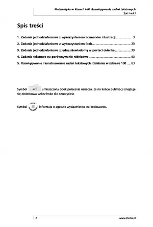 Książka sprawi, że dzięki kreatywnym i ćwiczącym myślenie zadaniom dziecko usprawni myślenie logiczne, nauczy się sprawnie zapisywać rozwiązanie zadania tekstowego, rozwinie swoją spostrzegawczość i technikę poprawnego liczenia, zarówno przedmiotów na kartce, jak i liczmanów, będzie coraz lepiej rozumiało czytany tekst, a także wykorzysta w praktyce poznane zasady matematyczne. Dodatkowo na końcu publikacji znajdują się wskazówki dla nauczyciela, oznaczone charakterystycznym symbolem.