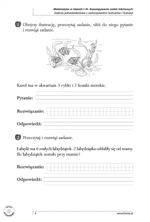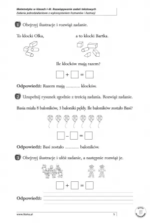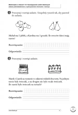 - Zadania z treścią, które pokazują dzieciom, jak wykorzystywać matematykę w codziennym życiu – uczą liczenia w praktyce, a także rozwiązywania problemów.