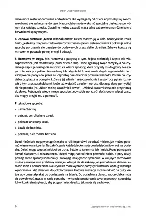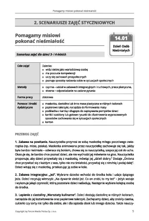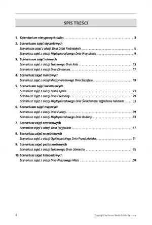 Publikacja zawiera 14 scenariuszy zajęć z okazji wyjątkowych dni takich jak: Dzień Przytulania, Dzień Osób Nieśmiałych, Dzień Szczęścia, Dzień Uśmiechu, Dzień Pluszowego Misia, Dzień Świadomości Zagrożenia Hałasem oraz wiele innych, które poszerzają wiedzę dzieci w wieku przedszkolnym.