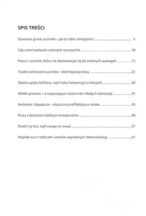 Książka zawiera informacje dotyczące najbardziej “problematycznych problemów” nauczycieli. Trudności wychowawcze ucznia przyczyniają się do dezorganizacji zajęć, wpływają na pozostałych uczniów i odbijają się na nauczycielu. Szybka i trafna pomoc może przyczynić się do zażegnania wielu palących konfliktów i przede wszystkim wspomóc ucznia w wyborze odpowiedniego kierunku rozwoju. Książka wskazuje jakich postaw wychowawczych unikać i jak pobłażanie nieodpowiednim zachowaniom może zachwiać całym procesem edukacji.