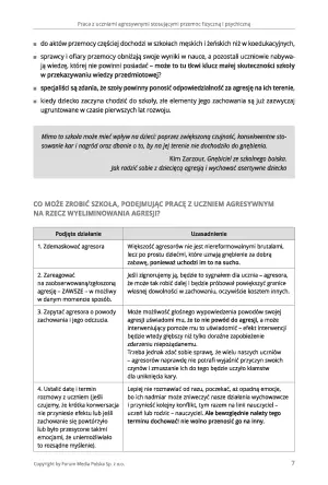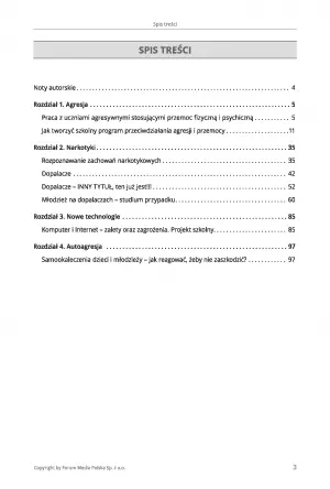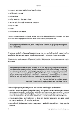 W książce znajdziesz także różne sposoby podejścia do radzenia sobie z agresją w szkole, wykaz instytucji oferujących wsparcie w sytuacji wystąpienia przemocy rówieśniczej, arkusze i załączniki, które mogą być pomocne podczas zapobiegania sytuacjom problemowym, studium przypadków związanych z młodzieżą na dopalaczach i proponowaną strategię postępowania.