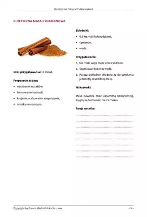 Książka zawiera 10 przepisów na masy sensoplastyczne, nadające się dla dzieci najmłodszych, w wieku przedszkolnym i dzieci w wieku wczesnoszkolnym. Każdy przepis składa się z grafiki, orientacyjnego czasu przygotowania masy sensoplastycznej, składników potrzebnych do jej wykonania, przepisu oraz wskazówek dodatkowych. Pod każdym przepisem znajduje się także miejsce na notatki, w którym możesz nanosić własne poprawki czy modyfikacje przepisu.