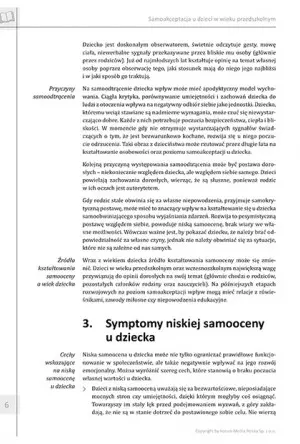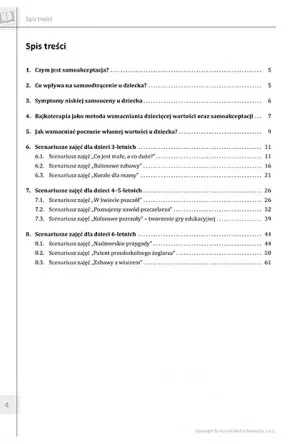 Dzieci szczególnie narażone są na docinki ze strony rówieśników oraz wytykanie błędów. Mimo nauki ogólnej tolerancji i szacunku do innych, warto wyposażyć dzieci w dodatkową ochronę, która niczym tarcza, będzie je osłaniać przed “najgorszymi” trudnościami. Samoakceptacja sprawi, że dzieci staną się bardziej odporne psychicznie, a czynniki zewnętrzne nie będą w stanie długotrwale wpływać negatywnie na ich nastrój oraz rozwój emocjonalny. Takie działanie spowoduje, że zmniejszymy u nich ryzyko wystąpienia potencjalnych lęków czy depresji i wesprzemy procesy samorealizacji, które dadzą im szczęście. Scenariusze zajęć zawierają gry, bajki, wierszyki i liczne ilustracje, dzięki którym lekcje staną się dla dzieci ciekawe, atrakcyjne i zmobilizują je do pełnego zaangażowania wszystkich zmysłów.