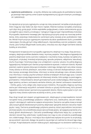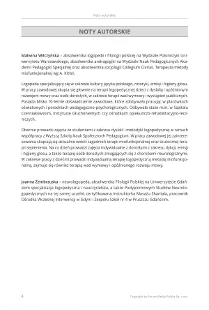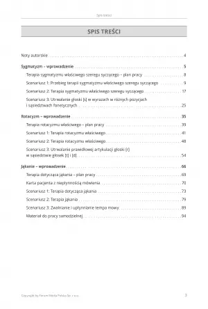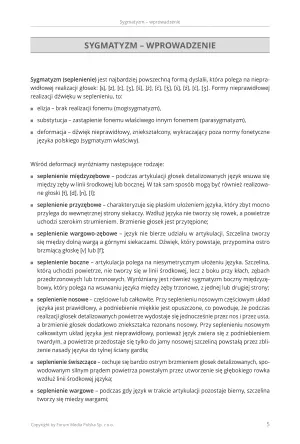 Ponadto każdy rozdział zawiera szeroko opisane wprowadzenie, co pozwala w pełni skupić się na danym zagadnieniu. Podczas opisywanych ćwiczeń przedstawiono cel terapii, umiejętności, jakie powinien zdobyć pacjent oraz przewidywany czas terapii. Dzięki temu terapeuta może dokładnie analizować postępy pacjenta i skupić się na ewentualnych problematycznych elementach wymowy.