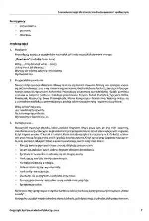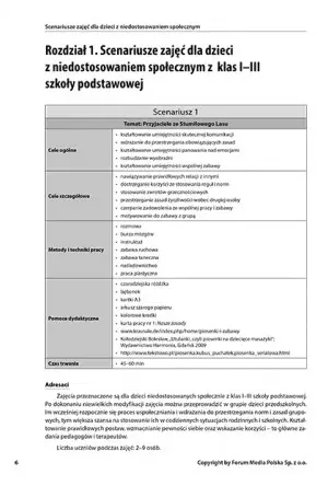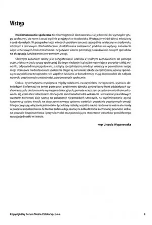 Publikacja zawiera 9 scenariuszy zajęć, po 3 dla każdego etapu: klasa I-III, klasa IV-VIII i szkoła ponadpodstawowa. W każdym scenariuszu dokładnie omówione są cele ogólne i szczegółowe zajęć, metody i techniki pracy, potrzebne pomoce dydaktyczne oraz orientacyjny czas trwania, a także formy pracy i przebieg zajęć. Zaproponowane przez autorkę ćwiczenia sprawią, że dziecko z niedostosowaniem społecznym dostrzeże swoje mocne i słabe strony, nauczy się radzić ze swoimi emocjami i rozumieć potrzeby innych, zrozumie także korzyści wynikające z przyjaźni oraz będzie potrafiło reagować w sposób prawidłowy w rozmaitych sytuacjach.