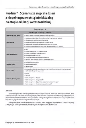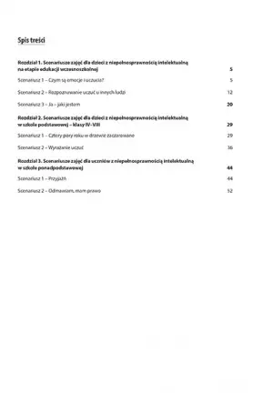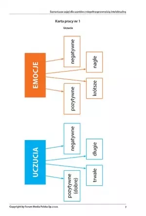 Opracowanie uwzględnia zajęcia indywidualne i grupowe. Każdy rozdział zawiera dokładne informacje dotyczące celu zajęć, ich formy oraz narzędzi edukacyjnych niezbędnych do wykonania ćwiczeń. Liczne rebusy, ilustracje i wycinanki w łatwy sposób przedstawiają i przekazują skomplikowaną wiedzę. Emocje nie są niekiedy łatwe do zdefiniowana, a osoby z niepełnosprawnością intelektualną mogą mieć z tym szczególne trudności. Scenariusze w przystępny sposób przedstawiają świat emocji, dzięki czemu dziecko bez trudu będzie w stanie zrozumieć swoje uczucia, co przełoży się na jego rozwój intelektualny.
