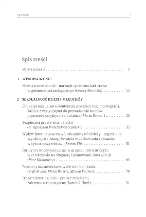 Dodatkowo w publikacji znajdziemy ogólne zasady edukacji seksualnej, a także problematykę prowadzenia jej przy powszechnym dostępie do pornografii, ogólne zasady przeciwdziałania przemocy seksualnej, zasady bezpiecznego korzystania przez dzieci z Internetu, zasady działania psychologa w przypadku zgłoszenia zaburzenia tożsamości płciowej u młodzieży oraz problemy doświadczane przez małżeństwo nieskonsumowane.