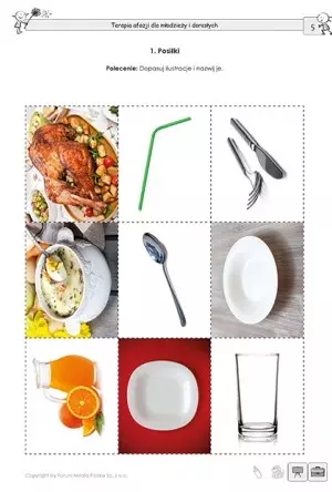 Publikacja zawiera 22 karty pracy. Są one oznaczone piktogramem oznaczającym, że nadają się do pracy z dziećmi w wieku szkolnym i osobami dorosłymi, dotkniętymi afazją. W pozycji znajdziesz zadania, które ćwiczą określanie stosunków przestrzennych, budowanie zdań i ich uzupełnianie, wzbogacają słownictwo bierne i czynne, wyzwalają wypowiedzi i pomagają w kategoryzowaniu.