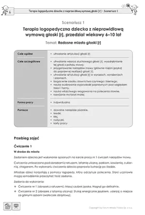 Ćwiczenia umieszczono pod obrazkami z ratuszem, latarnią uliczną, parkiem, kawiarnią, cukiernią, straganem. Po wykonaniu ćwiczenia dziecko poprawia ilustrację po śladzie. Młodsze dzieci korzystają z pomocy logopedy, który odczytuje polecenia. Starsi uczniowie mogą samodzielnie przeczytać treść zadania.