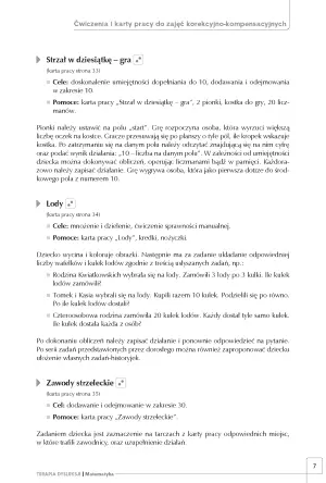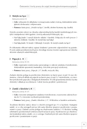 Całe opracowanie zawiera liczne gry i zabawy, uwzględniające ćwiczenia ruchowe (indywidualne oraz w parach) oraz ćwiczenia manualno-artystyczne jak: kolorowanie, wycinanie, łączenie, wyklejanie. Dzięki temu cały program edukacyjno-terapeutyczny nie jest monotonny i łatwo go dostosować do indywidualnych jednostek. Uzupełnieniem terapii przedstawionej w opracowaniu, jest zeszyt pracy w domu, który podtrzymuje nabyte umiejętności i zawiera kolejną partię, zupełnie nowych ćwiczeń. Dzięki temu program jest niezwykle bogaty i co najważniejsze, skuteczny.