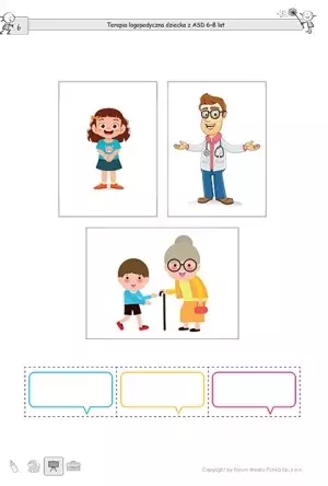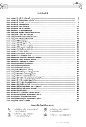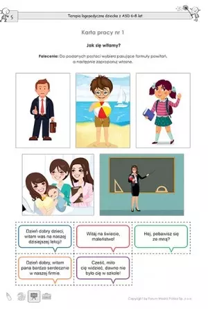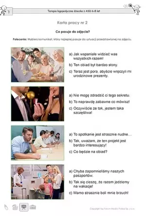 W książce znajdziesz aż 41 kart pracy! Wszystkie przeznaczone są dla dziecka w wieku 6-8 lat w spektrum. Dzięki zadaniom uczeń ćwiczy poprawną i zrozumiałą dla otoczenia mowę. Znajdziemy tu między innymi: wybieranie komunikatu pasującego do zdjęcia, poprawianie błędów w dialogach, naukę opisywania rozmaitych sytuacji, wybieranie pasującej formuły pożegnań, opisywanie uczuć osób na obrazkach i odpowiadanie na pytania na podstawie fotografii. Każda karta pracy opatrzona jest krótkim i zrozumiałym dla dziecka poleceniem.