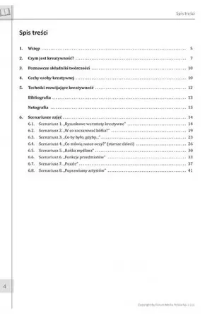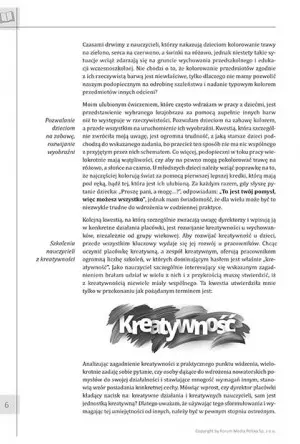 E-wydanie zawiera urozmaicone scenariusze zajęć, które staną się praktycznym narzędziem rozwijającym kreatywność dzieci. Nauczyciel już na samym wstępie ma przedstawiony główny cel ćwiczeń, metodę działania i pomoce dydaktyczne, co sprzyja jego dobremu przygotowaniu się do lekcji. Dodatkowo prezentowane scenariusze dbają o rozwijanie innych elementów wspierających kreatywność tj. rozbudzanie wiary we własne możliwości, myślenia dedukcyjnego i ciekawości poznawczej.