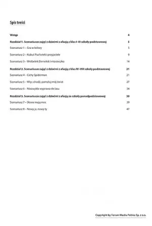 Każdy ze scenariuszy zawiera opis celu, metody wykorzystanej w schemacie, narzędzia dydaktyczne oraz czas trwania zajęć. Stanowią one podstawę prowadzenia zajęć, ale pozwalają na dowolną modyfikację, która przyczyni się do indywidualnego rozwoju ucznia. Opracowanie zawiera atrakcyjne rysunki, piktogramy oraz ilustrację, które ożywią każde zajęcia i zachęcą dziecko z afazją do pełnego zaangażowania.