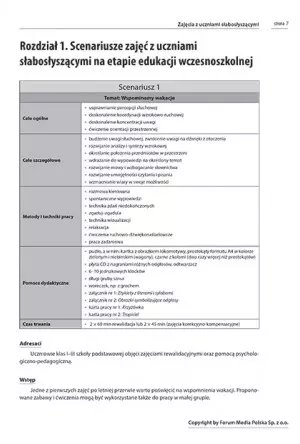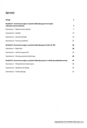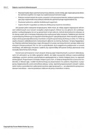 Każdy ze scenariuszy zawiera opis celu, metody wykorzystanej w schemacie, niezbędne pomoce i narzędzia dydaktyczne oraz czas trwania zajęć. Pomoże Ci to maksymalnie zwiększyć efektywność swoich zajęć i zapewnić ich odpowiedni odbiór. Ponieważ osoby cierpiące na zaburzenia słuchu często się dekoncentrują, scenariusze są niezwykle zróżnicowane i angażujące uwagę ucznia słabosłyszącego, by ten nie odczuwał monotonii zajęć.