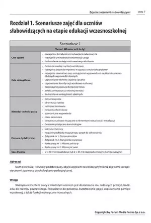 Publikacja zawiera 9 rozbudowanych scenariuszy zajęć dla uczniów słabowidzących: 3 dla dzieci na etapie edukacji wczesnoszkolnej, 4 dla uczniów na etapie edukacji szkolnej i 2 dla etapu szkoły ponadpodstawowej. Zadania zawarte w scenariuszach zajęć pomagają w ćwiczeniu analizy i syntezy wzrokowej, rozwijaniu procesów myślenia w oparciu o materiał wzrokowy, zwiększaniu poczucia własnej wartości, zaspokajaniu podstawowych potrzeb związanych z bezpieczeństwem, kształtowaniu koncentracji i wyobraźni oraz rozwoju zdolności krytycznego myślenia