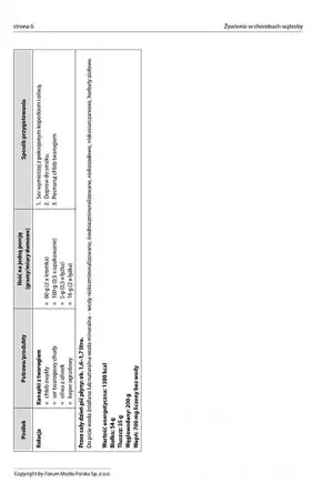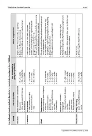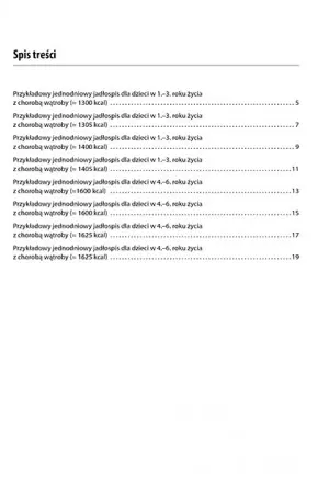 Pod każdym jadłospisem znajduje się: ilość płynów, jaką powinno wypić dziecko, wartość energetyczna diety oraz ilość białek, tłuszczów, węglowodanów i wapnia. Przy podstawowej wiedzy na temat diety wątrobowej jadłospisy można modyfikować, biorąc pod uwagę preferencje żywieniowe dziecka.