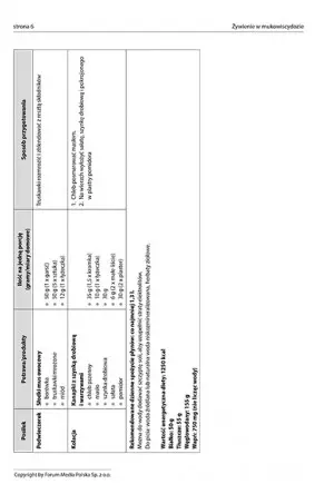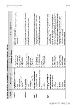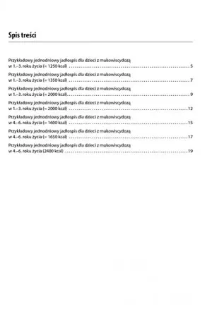 Posiłki dla dzieci powinny przede wszystkim być smaczne! Pamiętaliśmy o tym. W jadłospisie znajdziesz przepisy na takie potrawy, jak: zupa krem z groszku na mleku, czekoladowa pasta z awokado czy owocowy deser z pęczakiem. Pod każdym jadłospisem znajduje się ilość kalorii, którą spożyło dziecko żywiące się według jadłospisu, a także białek, tłuszczy, węglowodanów i wapnia. Jadłospisy podzielone zostały na dwie grupy wiekowe: 1-3 i 4-6 lat.
